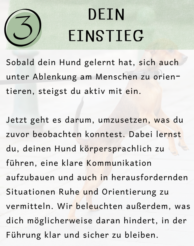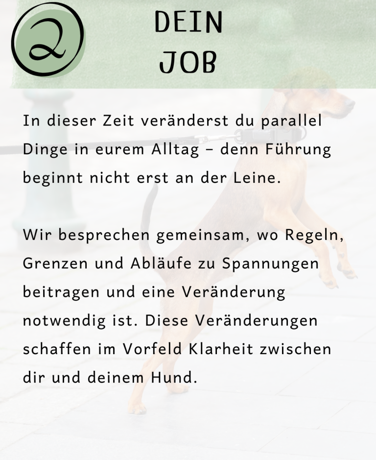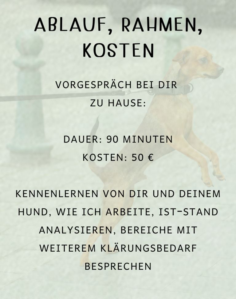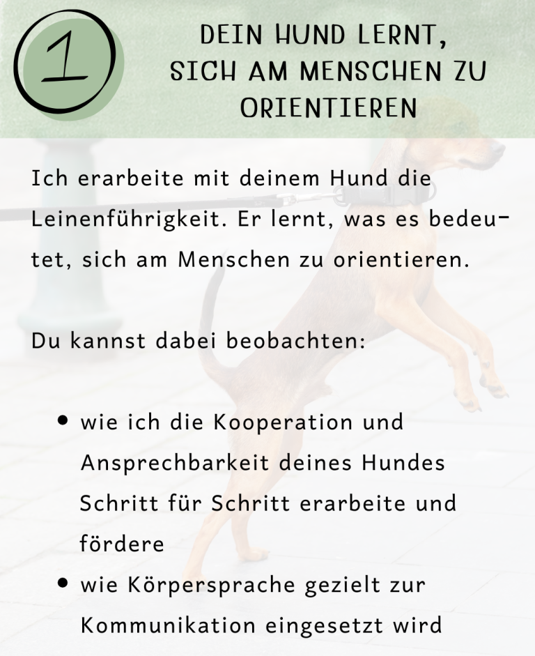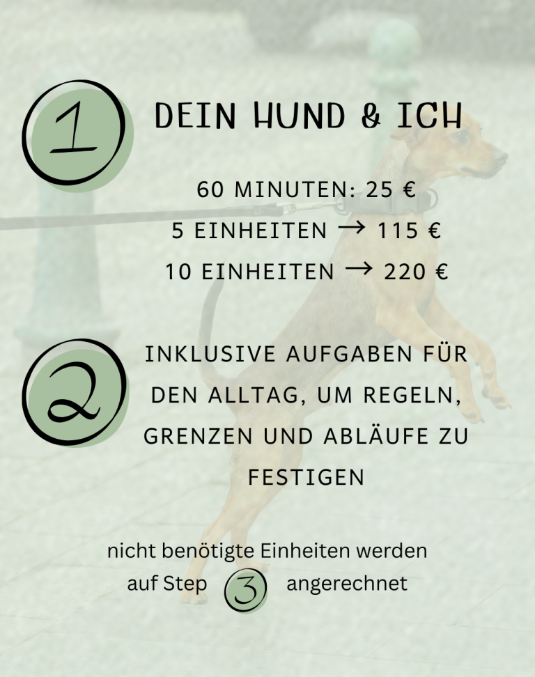 Ich begleite dich dabei, praktische Wege zu finden, die in euren Alltag passen, und gebe Impulse, damit ihr beide sicherer, entspannter und zufriedener miteinander umgehen könnt. Jede Einheit ist flexibel auf euch abgestimmt – Training, Beratung, Beobachtung und Reflexion.
