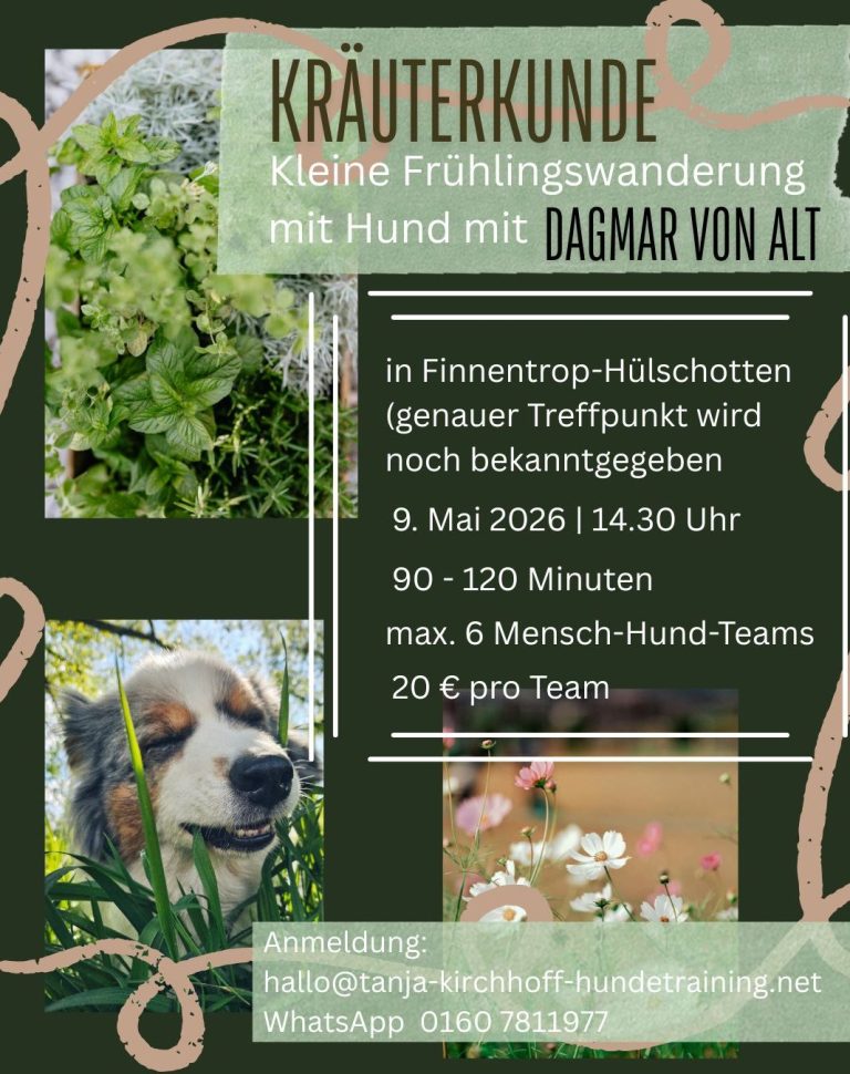 Mit unseren Hunden an der Seite erkunden wir gemeinsam mit Dagmar die Waldwege und Wiesen rund um Hülschotten und lernen heimische Frühlingskräuter wie Gundermann, Bärlauch, Giersch, Löwenzahn oder Wegerich kennen.
